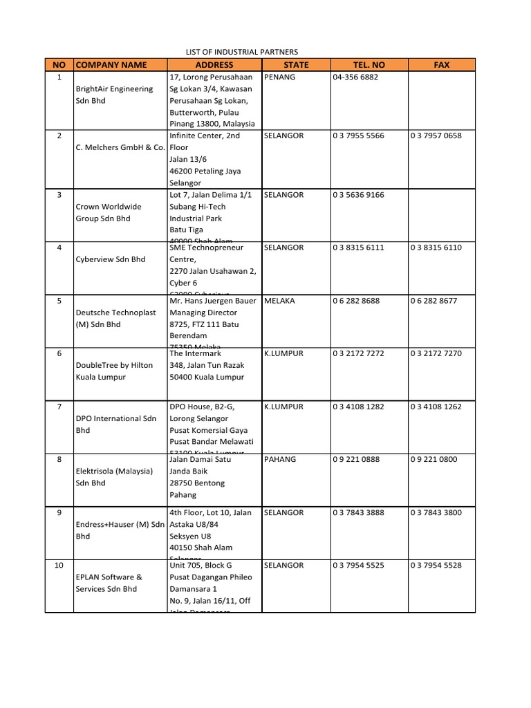 List Of Industrial Partners With Unikl Pdf Malaysia